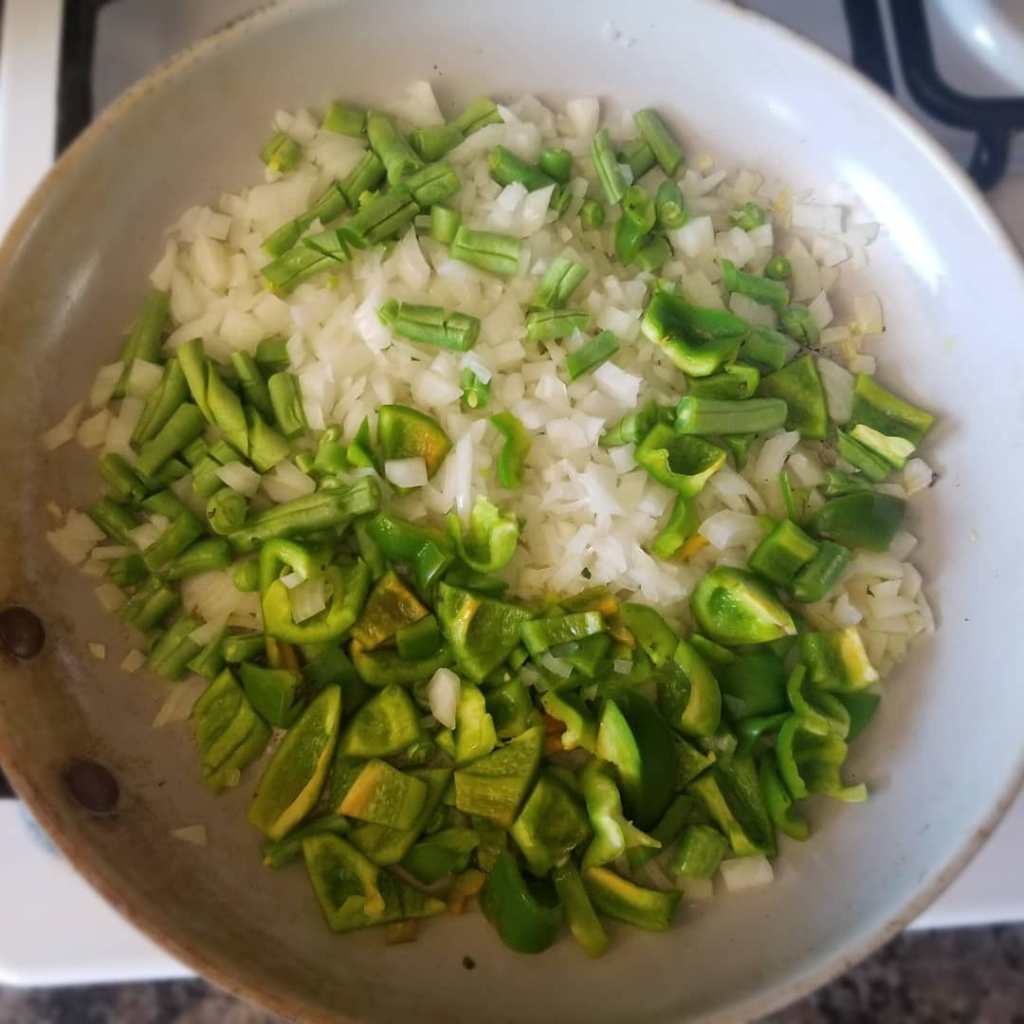In a large skillet, add a TBSP of olive oil and heat up. Once heated, add onions, green peppers and any other veggies you want to add. Saute until onions are soft. Add mushrooms (I did not use them) soy sauce and garlic, cook for another 3 minutes. Add in oregano, basil and brown sugar. Cook for an additional 1 minute.